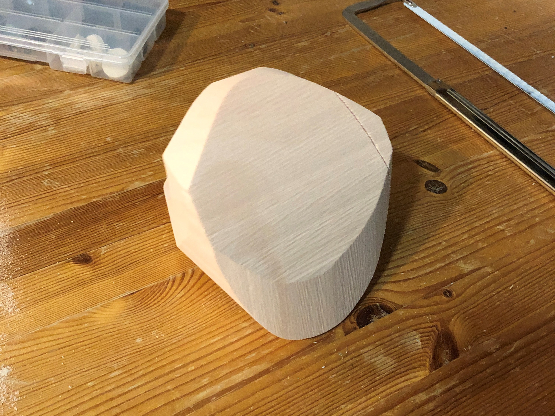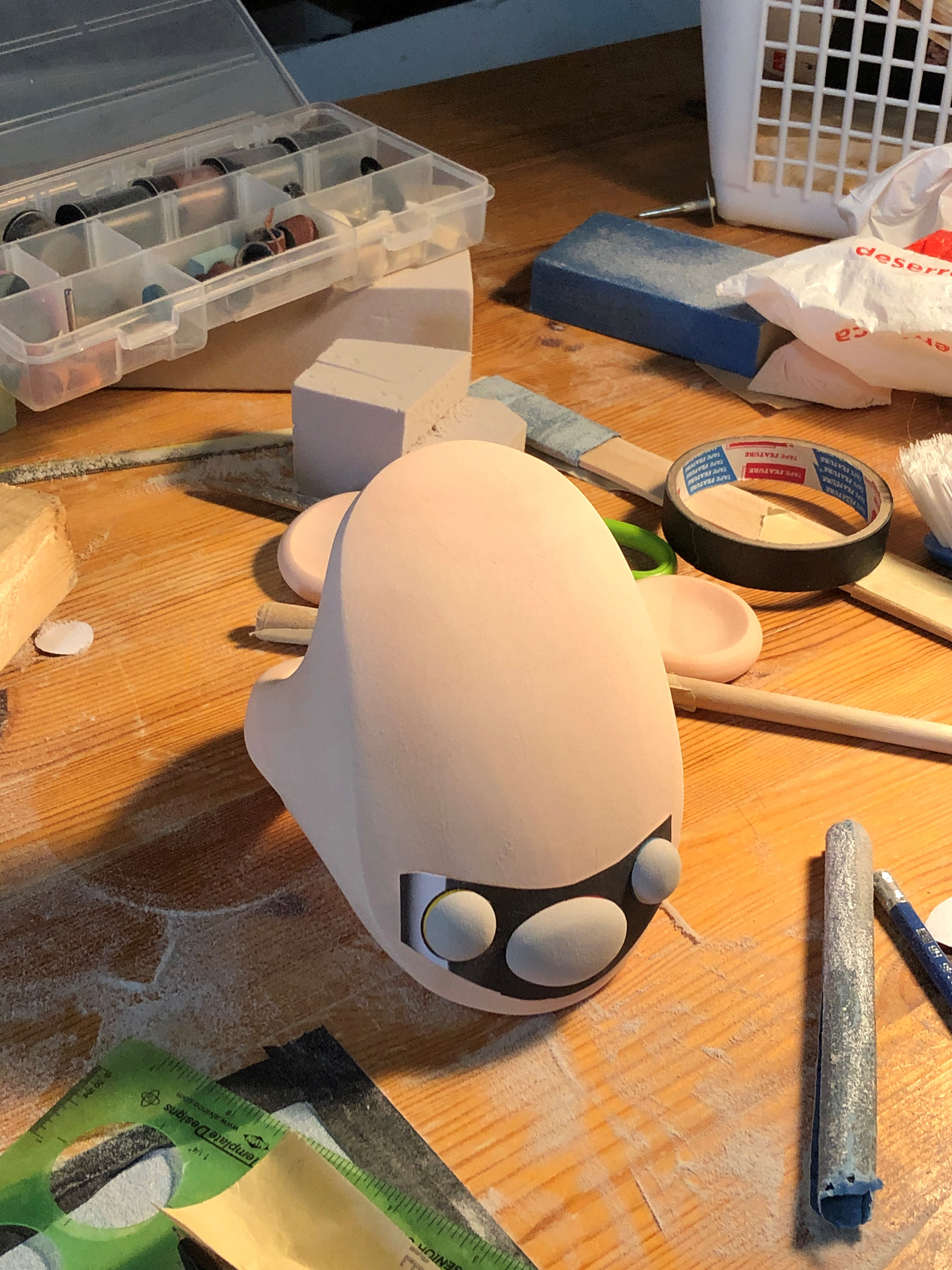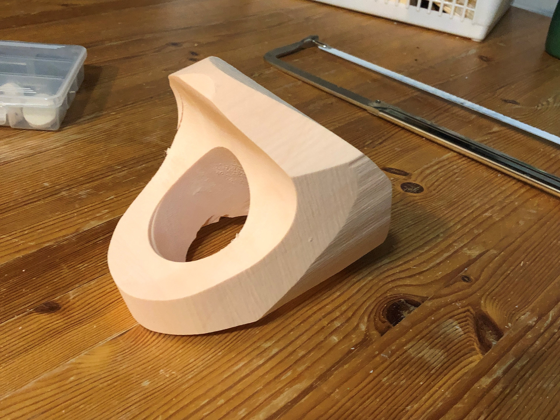The model-making process had some unique challenges. One of these was due to a workshop error. As this project was completed without direct access to workshop facilities, the model had to be made at home. Some rough cuts were made on the urethane foam block by the workshop remotely, but as can be seen in the first and second images, the front face was cut upside down. This presented itself as a chance to revisit the form design, and the material removal and edge rounding that occurred as a result provided a much better aesthetic overall. The CAD file was then reworked to reflect the changes, and the final design was improved in the end by the error.