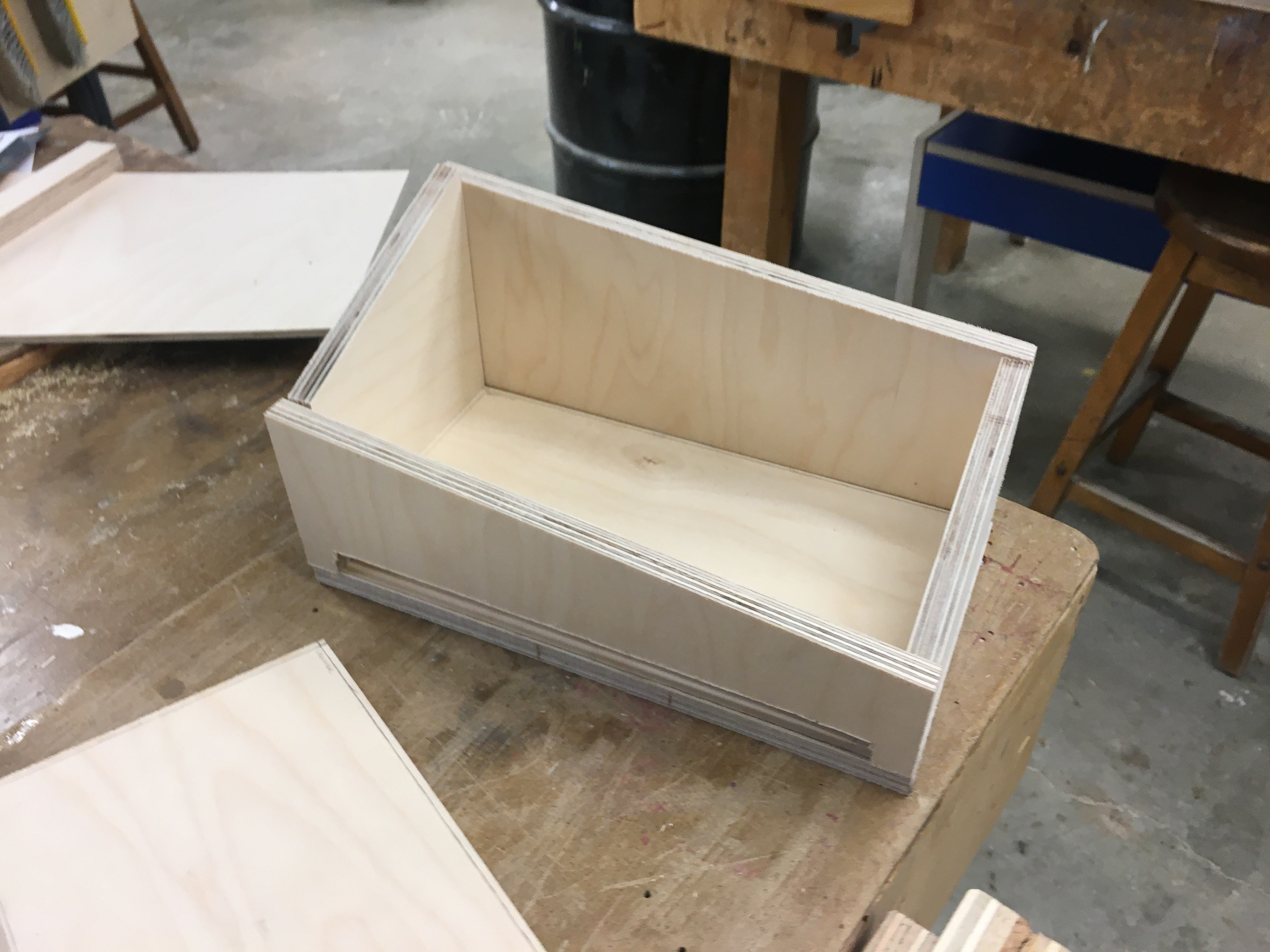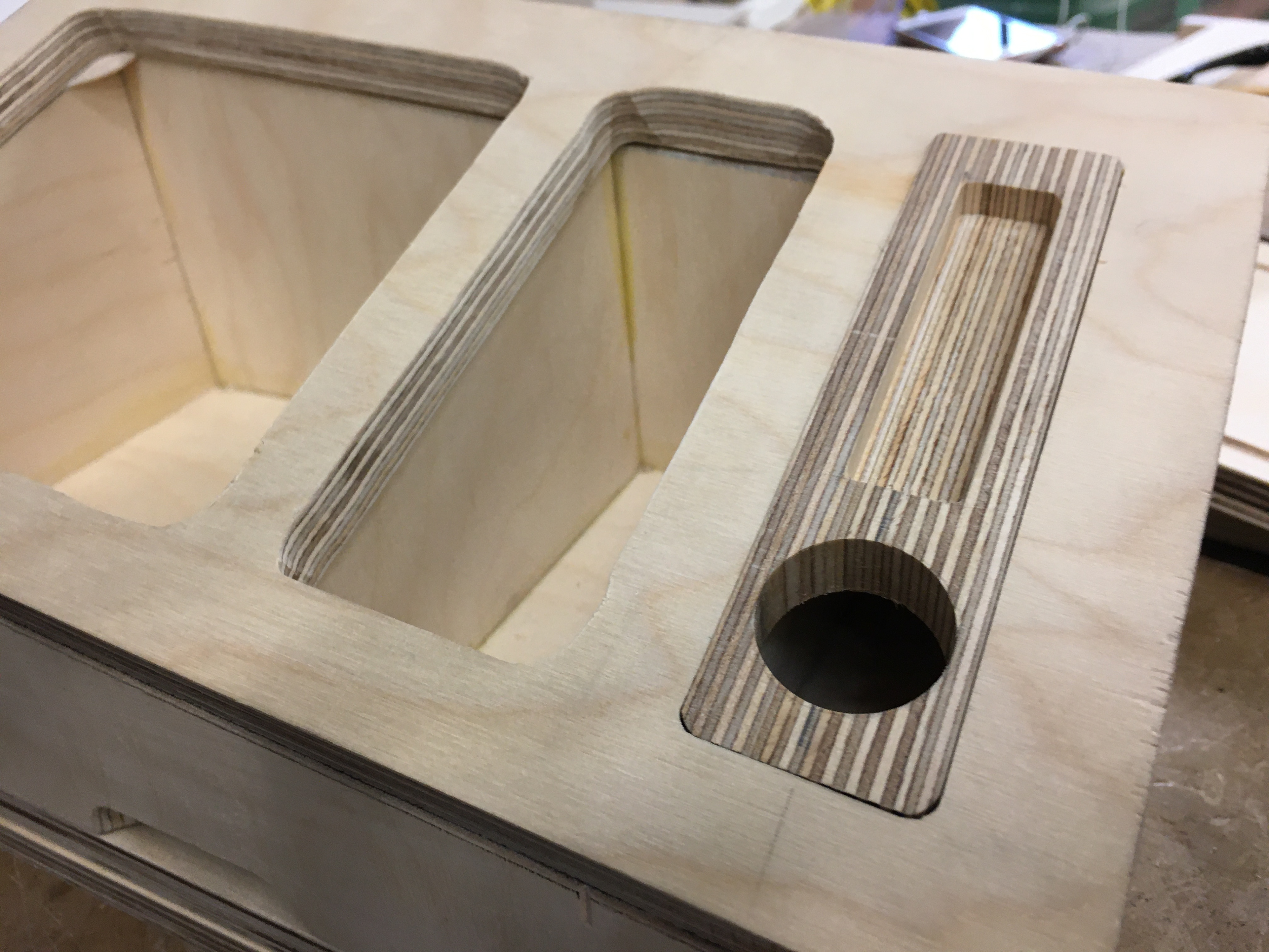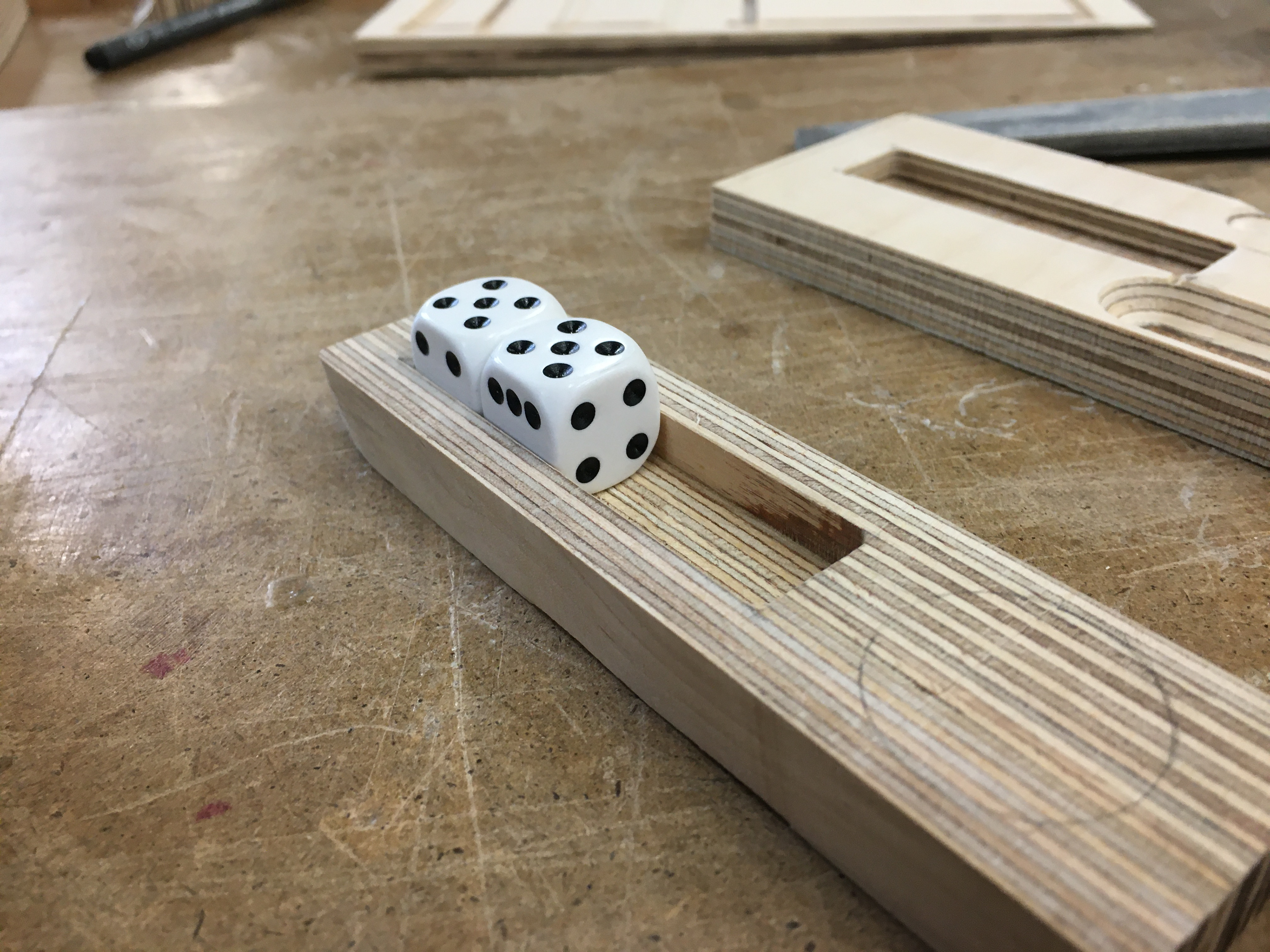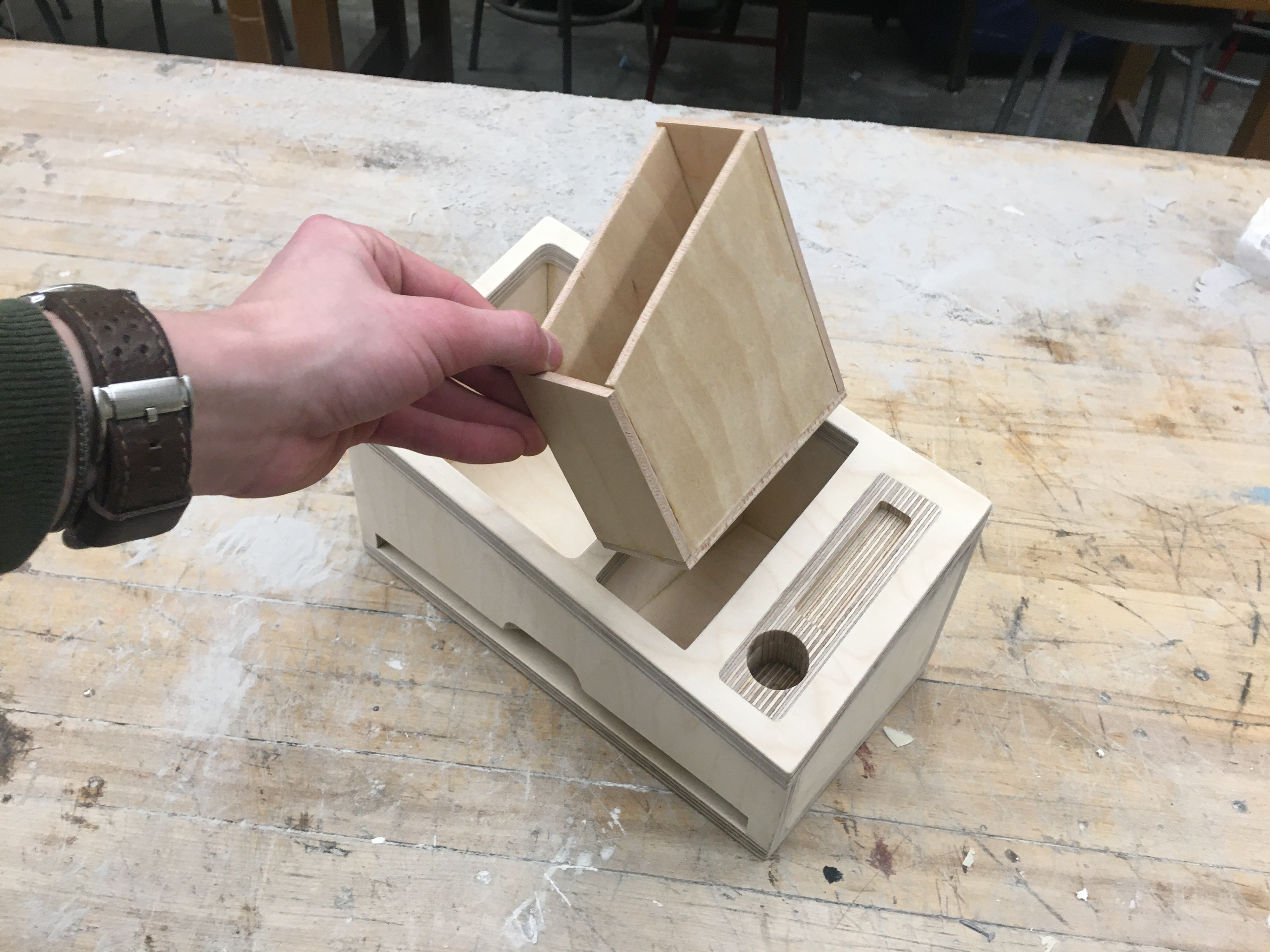 The final product is an organizer for card games, dice, tokens, and a sand timer. The pull-out chalkboard was increased to the full width of the organizer, and provides a more functional space for players to keep score The token box is angled to match the angle of the top of the box, which also serves as an affordance to guide the user towards pouring out the tokens. This organizer is designed such that it can be stored easily in a cupboard or shelf as well as placed on display in a common space.