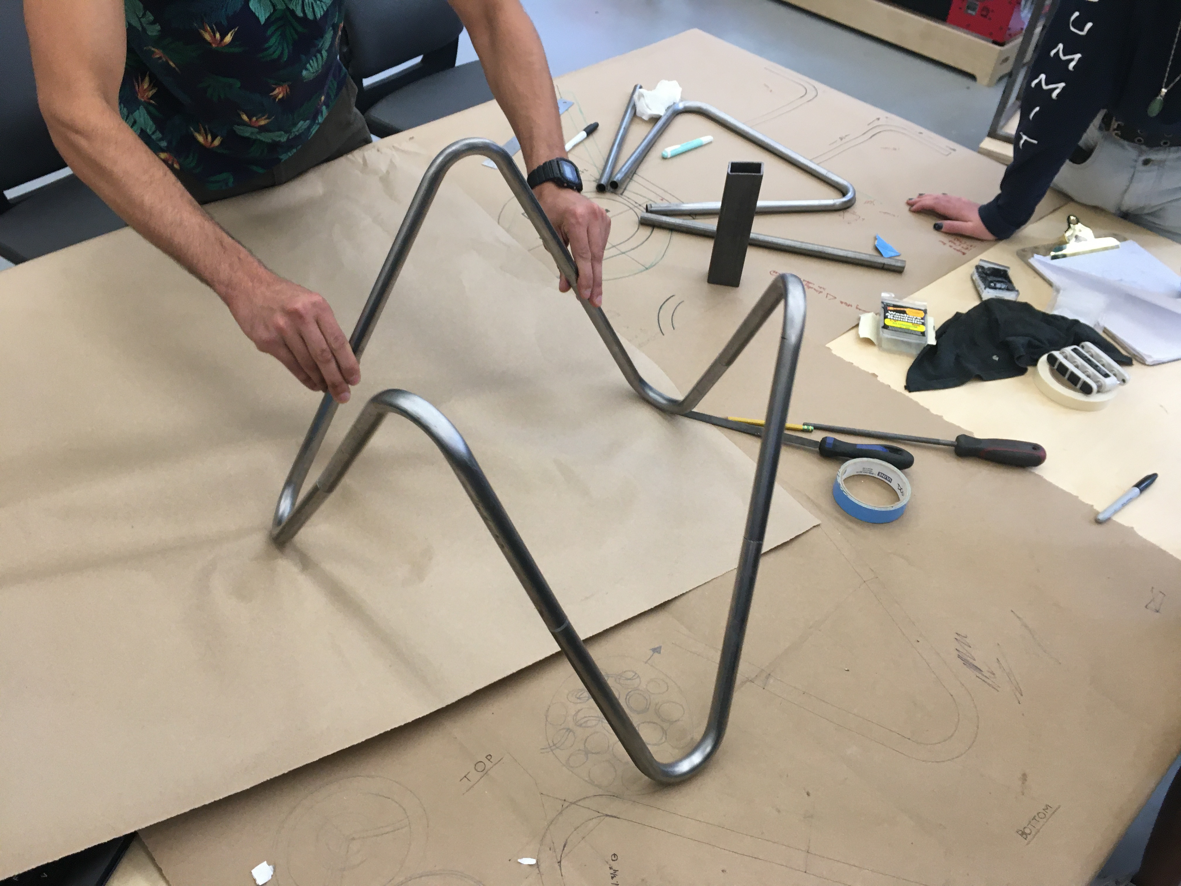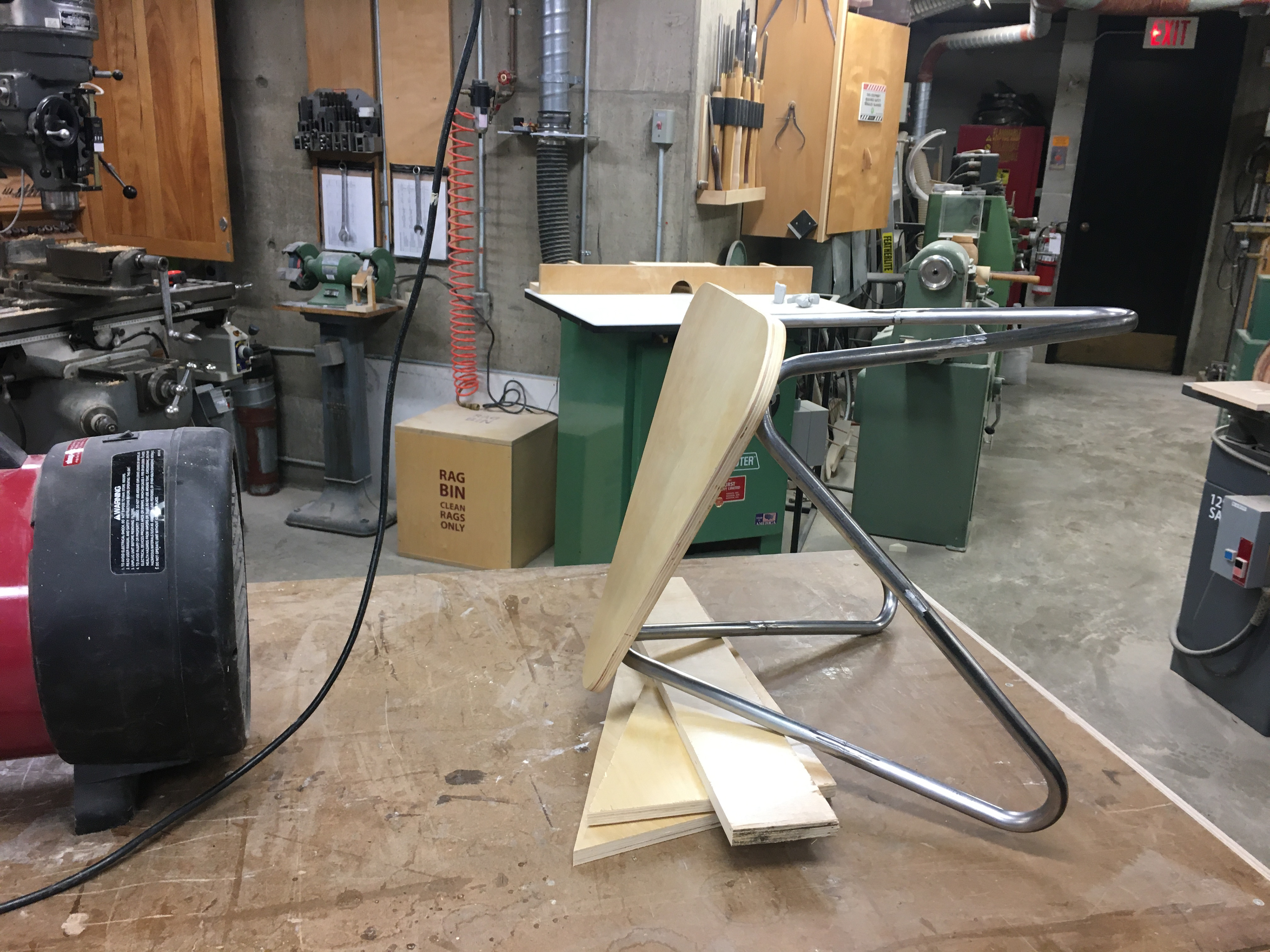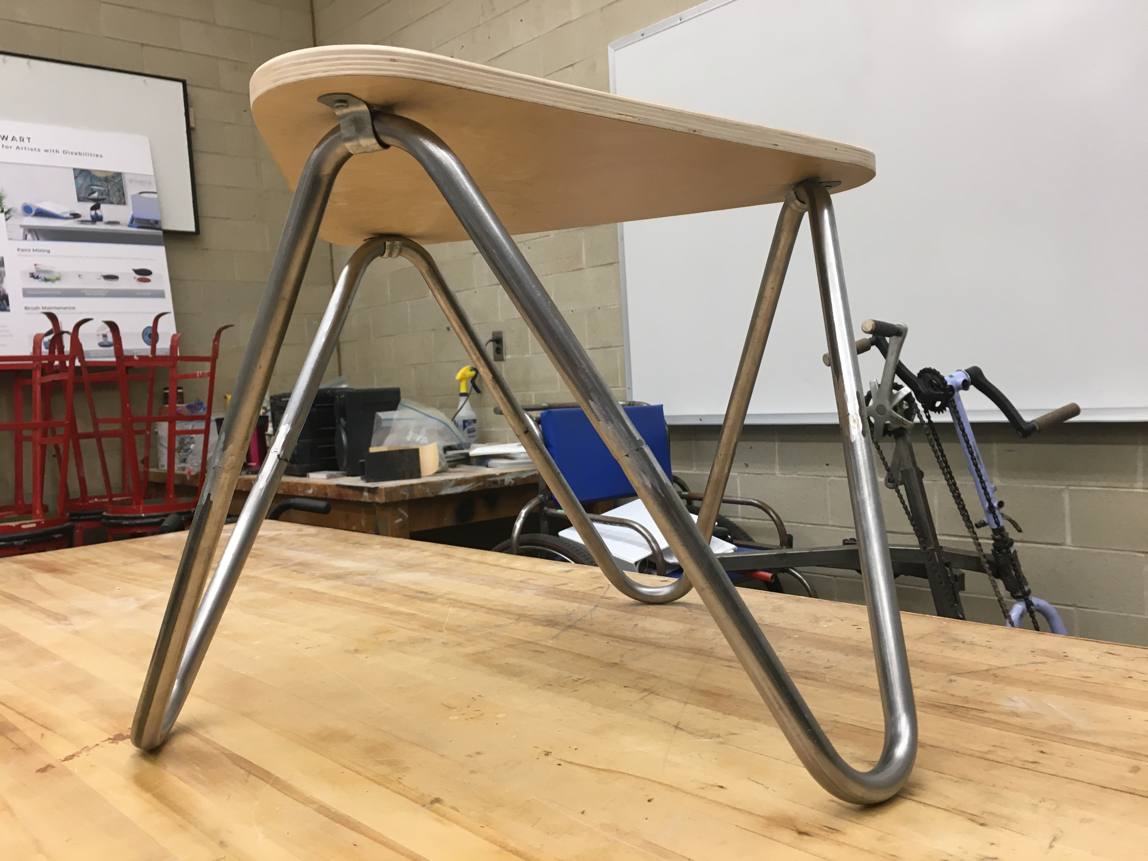 The aim of this group project was to gain experience working with bent metal tube, and to construct a functional stool out of real materials. Rather than having a focus on design, the goal was to explore fabrication methods. The design was a simple plywood seat on a three-legged zigzag base.